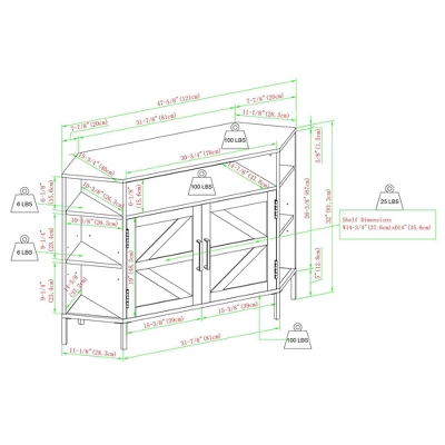 - Weight capacities: Top surface, cubby, and bottom panel 100 lbs. each, center shelf 25 lbs., side shelves 6 lbs. each