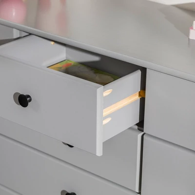 Situate Saracina Home’s Lauren Classic Transitional 9 Drawer Storage Dresser in your bedroom to expand your storage potential. Three large drawers and six smaller drawers make it easy to compartmentalize the contents, from socks to linens. The adaptable, transitional style looks just right in a child’s bedroom or a classic master suite. Responsibly-harvested solid pine and sturdy MDF materials promise a long-lasting storage console. Black metal hardware complements the smooth painted finish to make your home look neat and put together. For a complete bedroom set, pair with the Lauren nightstand.